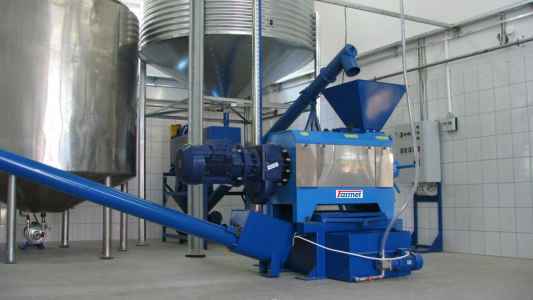 Шнековые маслопрессы FL 200 FS 1010 FL 200 Шнековый маслопресс FL 200 – особо массивная машина, которая лежит в основе наших прессовочных цехов средней производительности. Этот пресс способен перерабатывать широкий перечень обрушенных и необрушенных семян в самых разных режимах прессования. «Сердцем» маслопресса является его геометрия (форма шнека), которая оптимизируется для каждой культуры индивидуально и этим позволяет достичь наилучшего выхода масла. Различные схемы подключения прессов позволяют составлять технологические линии отжима масла разной производительности. Пресс можно использовать для переработки масличных семян в технологии холодного, горячего прессования и прессования с экструзией. Название файла Размер файла FL 200.pdf 1,5 MB Описание технологии Принадлежности Технические параметры Фотогалерея FL 200 – это шнековый пресс для переработки масличных. Под влиянием изменения формы шнека в разных отделах пресса (геометрии) происходит постепенное сжатие прессуемого материала. Под действием возрастающего давления происходит выдавливание масла из семян и оттекание через щели оттока в корзине пресса. Изменение геометрии пресса и ширины щелей оттока масла позволяет оптимизировать процесс прессования для отдельных видов масличных и для разных режимов отжима. Компания Farmet предлагает широкий выбор дополнительных (необязательных) принадлежностей, которые удовлетворят любые потребности заказчиков - загрузочных воронок (бункеров), транспортеров, емкостей, устройств для предварительной обработки семян, а также для перекачивания, фильтрации, рафинирования и хранения масла. Однако мы считаем лучшим решением поставку комплектной технологической линии «под ключ», т. к. только такой вариант является технически и экономически оптимальным решением Ваших требований, в т. ч. и автоматизации всего процесса. Шнековый маслопресс FL 200 – пресс средней мощности, достигающий производительности 4-40 тонн в сутки. В стандартном варианте он рассчитан на подсоединение к электросети, отвечающей спецификации ЕС, но электропроводку можно адаптировать и к требованиям локальных рынков (США, Канада…). Пресс можно оборудовать преобразователем частот главного привода, что позволит оптимизировать процесс прессования. Мощность электродвигателя этого пресса - 11-22 кВт в зависимости от технологии.